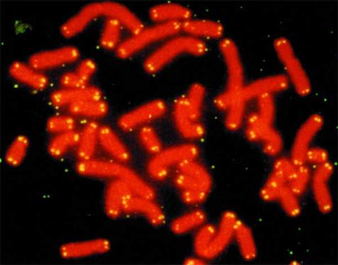 人类染色体端粒DNA的荧光原位杂交照片(来自http://www.ornl.gov)