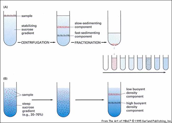 用一定的介质在离心管内形成一连续或不连续的密度梯度,将细胞混悬液或匀浆置于介质的顶部,通过重力或离心力场的作用使细胞分层、分离。这类分离又可分为速度沉降和等密度沉降平衡两种(图2-23)。密度梯度离心常用的介质为氯化铯,蔗糖和多聚蔗糖。分离活细胞的介质要求:1)能产生密度梯度,且密度高时,粘度不高;2)PH中性或易调为中性;3)浓度大时渗透压不大;4)对细胞无毒。