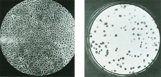 细胞培养方式大致可分为两种(图2-25):一种是群体培养(mass culture),将含有一定数量细胞的悬液置于培养瓶中,让细胞贴壁生长,汇合(confluence)后形成均匀的单细胞层;另一种是克隆培养(clonal culture),将高度稀释的游离细胞悬液加入培养瓶中,各个细胞贴壁后,彼此距离较远,经过生长增殖每一个细胞形成一个细胞集落,称为克隆(clone)。一个细胞克隆中的所有细胞均来源于同一个祖先细胞。此外,为了制取细胞产品而设计了转鼓培养法,使用大容量的圆培养瓶,在培养过程中不断地转动,使培养的细胞始终处于悬浮状态之中而不贴壁。