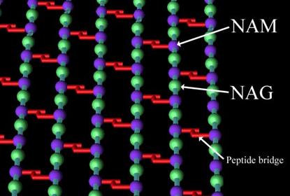 肽聚糖是革兰阳性菌细胞壁的主要成分,凡能破坏肽聚糖结构或抑制其合成的物质,都有抑菌或杀菌作用。如溶菌酶是N-乙酰胞壁酸酶,青霉素抑制转肽酶的活性,抑制肽桥形成。