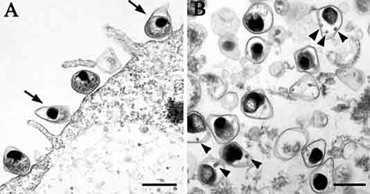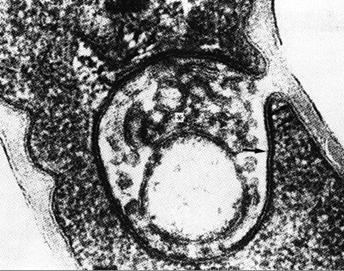 图3-18 衣原体Chlamydia pneumoniae 梨子形的原体(EBs),左、吸附在巨噬细胞表面,右、进入细胞内部的原体,图片来自iwww.bioscience.org/2002/