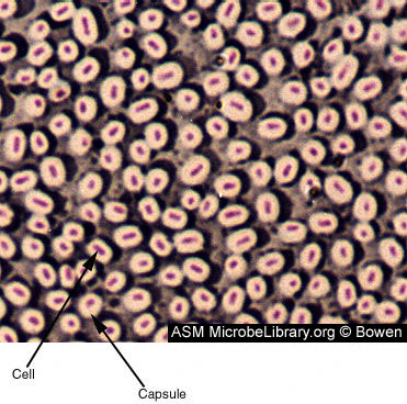 一种细菌的负染照片,显示荚膜 图片来自http://www.microbelibrary.org