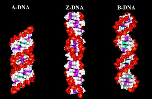 Z-DNA:为左手螺旋,每圈螺旋12个碱基,螺旋扭角为-51度(G—C)和-9度(C—G),螺距46A,每个碱基对的螺旋上升值为3.5A(G—C)和4.1A(C—G),碱基倾角为9度。