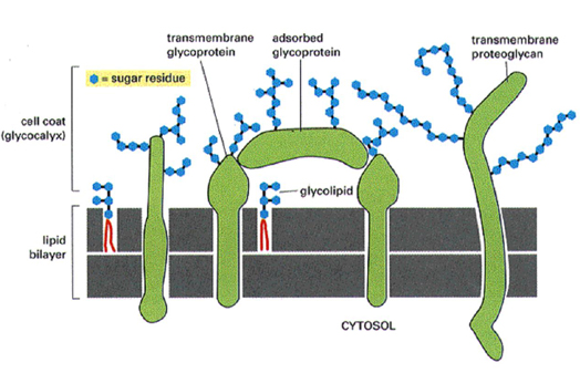 动物细胞表面存在着一层富含糖类物质的结构,称为细胞外被(cell coat)或糖萼(glycocalyx)。用重金属染料如:钌红染色后,在电镜下可显示厚约10~20nm的结构,边界不甚明确。细胞外被是由构成质膜的糖蛋白和糖脂伸出的寡糖链组成的,实质上是质膜结构的一部分(图4-18)。