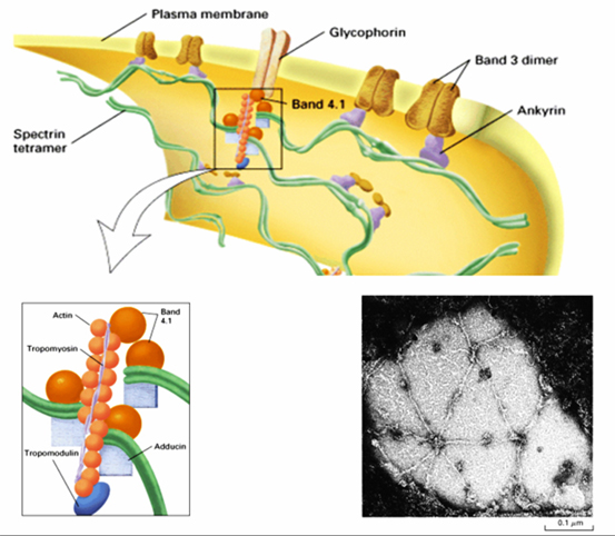 血影蛋白四聚体游离端与短肌动蛋白纤维(约13~15单体)相连,形成血影蛋白网络。并通过带4.1蛋白与血型糖蛋白连结,通过锚蛋白与带3蛋白相连。这一骨架系统赋与了红细胞质膜的刚性与韧性,得以几百万次地通过比它直径还小的微血管、动脉、静脉。至于红细胞的双凹型可能还与肌球蛋白的作用有关。