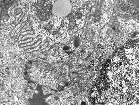 内褶(infolding,图4-22)是质膜由细胞表面内陷形成的结构,同样具有扩大了细胞表面积的作用。这种结构常见于液体和离子交换活动比较旺盛的细胞。