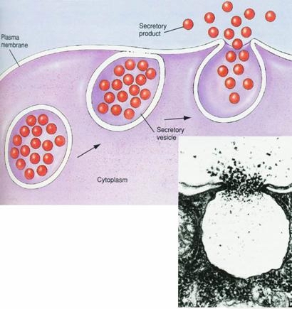 与内吞作用的顺序相反,某些大分子物质通过形成小囊泡从细胞内部移至细胞表面,小囊泡的膜与质膜融合,将物质排出细胞之外,这个过程称为外排作用(exocytosis),细胞内不能消化的物质和合成的分泌蛋白都是通过这种途径排出的(图5-15)。