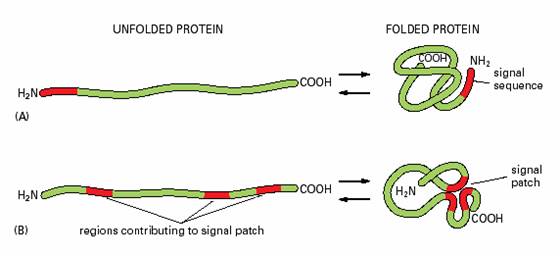 ②信号斑(signal patch):存在于完成折叠的蛋白质中,构成信号斑的信号序列之间可以不相邻,折叠在一起构成蛋白质分选的信号。