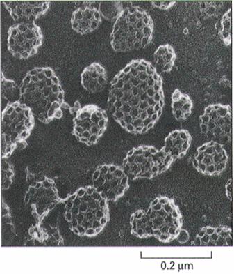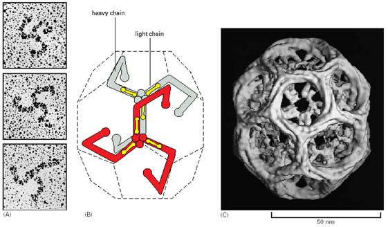 图6-2 笼形蛋白的结构,A电镜照片,B分子模型,C衣被模型 引自Molecular