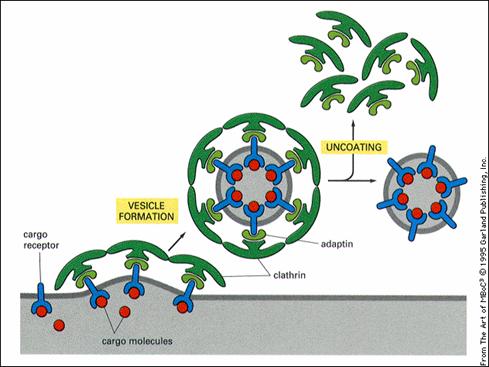 受体同配体结合后启动内化作用,笼形蛋白开始组装。在dynamin的作用下掐断后形成衣被小泡(coated vesicles)。衣被小泡进入胞质后,衣被蛋白随即脱去,分子返回到质膜下方,重又参与形成新的衣被小泡。其过程和高尔基体的TGN区形成溶酶体小泡的过程相似。