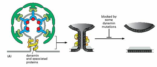 off)衣被小泡。动力素是一种GTP酶,调节小泡以出芽形式脱离膜的速率。动力素可以召集其它可溶性蛋白在小泡的颈部聚集,通过改变膜的形状和膜脂的组成,促使小跑颈部的膜融合,形成衣被小泡。