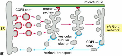 由内质网到高尔基体的蛋白转运中,大多数跨膜蛋白是直接结合在COP II衣被上,但是少数跨膜蛋白和多数可溶性蛋白通过受体与COP II衣被结合,这些受体在完成转运后,通过COP I衣被小泡返回内质网。