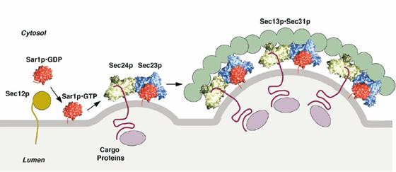 衣被召集GTP酶大量存在于细胞质中,但处于结合GDP的失活状态。当内质网上要形成COPII衣被小泡时,Sar 1释放GDP结合GTP而激活,激活的Sar 1暴露出一条脂肪酸的尾巴,插入内质网膜,然后开始召集衣被蛋白,以衣被蛋白为模型形成运输小泡。活化的衣被召集GTP酶还可以激活磷脂酶D(phospholipase D),将一些磷脂水解,使形成衣被的蛋白质牢固地结合在膜上。