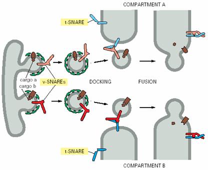 衣被小泡沿着细胞内的微管被运输到靶细胞器,马达蛋白水解ATP提供运输的动力。各类运输小泡之所以能够被准确地和靶膜融合,是因为运输小泡表面的标志蛋白能被靶膜上的受体识别,其中涉及识别过程的两类关键性的蛋白质是SNAREs(soluble NSF attachment protein receptor)和Rabs(targeting GTPase)。其中SNARE介导运输小泡特异性停泊和融合,Rab的作用是使运输小泡靠近靶膜。