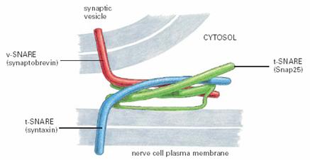 在神经细胞中SNAREs负责突触小泡的停泊和融合,破伤风毒素和肉毒素等细菌分泌的神经性毒素实际上是一类特殊的蛋白酶,能够选择性地降解SNAREs,从而阻断神经传导。