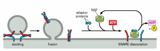 在SNAREs接到新一轮的运输小泡停泊之前,SNAREs必须以分离的状态存在,NSF(N-ethylmaleimide-sensitive fusion protein,