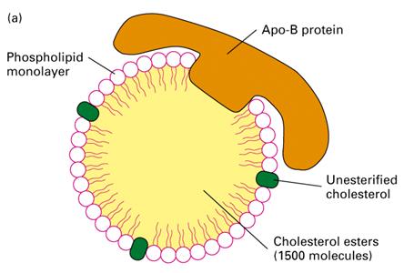 胆固醇主要在肝细胞中合成,随后与磷脂和蛋白质形成低密脂蛋白(low-density lipoproteins,LDL),释放到血液中。LDL颗粒的质量为3X106Da,直径20~30nm,芯部含有大约1500个胆固醇分子,这些胆固醇分子被酯化成长链脂肪酸。芯部周围由一脂单层包围,脂单层包含磷脂分子和未酯化的胆固醇以及一个非常大的单链糖蛋白质 (apolipoprotein B-100),这个蛋白质分子可以和靶膜上的受体结合(图6-15)。