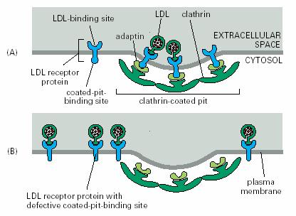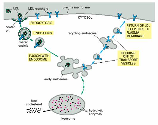 当细胞进行膜合成需要胆固醇时,细胞即合成LDL跨膜受体蛋白,并将其嵌插到质膜中。受体与LDL颗粒结合后,形成衣被小泡;进入细胞质的衣被小泡随即脱掉笼形蛋白衣被,成为平滑小泡,同早期内体融合,内体中PH值低,使受体与LDL颗粒分离;再经晚期内体将LDL送人溶酶体。在溶酶体中,LDL颗粒中的胆固醇酯被水解成游离的胆固醇而被利用(图6-16、17A、18)。细胞对胆固醇的利用具有调节能力,当细胞中的胆固醇积累过多时,细胞即停止合成自身的胆固醇,同时也关闭了LDL受体蛋白的合成途径,暂停吸收外来的胆固醇。有的人因为LDL受体蛋白编码的基因有遗传缺陷,造成血液中胆固醇含量过高(图6-17B),因而会过早地患动脉粥样硬化症(atherosclerosis),这种人往往因易患冠心病而英年早逝。