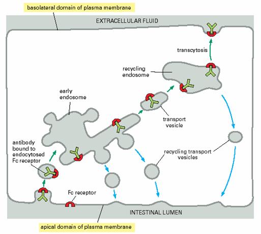 在受体介导的内吞作用过程中,不同类型的受体具有不同的胞内体分选途径:①大部分受体返回它们原来的质膜结构域,如LDL受体又循环到质膜再利用;②有些受体不能再循环而是最后进入溶酶体,在那里被消化,如与表皮生长因子(epidermal growth factor,EGF)结合的细胞表面受体,大部分在溶酶体被降解,从而导致细胞表面EGF受体浓度降低,称为受体下行调节(receptor down-regulation);③有些受体被运至质膜不同的结构域,该过程称作穿胞运输(transcytosis,图6-19)。在具有极性的上皮细胞,这是一种将内吞作用与外排作用相结合的物质跨膜转运方式,即转运的物质通过内吞作用从上皮细胞的一侧被摄人细胞,再通过外排作用从细胞的另一侧输出。如母鼠的抗体从血液通过上皮细胞进入母乳中,乳鼠肠上皮细胞将抗体摄人体内,都是通过跨细胞的转运完成的。