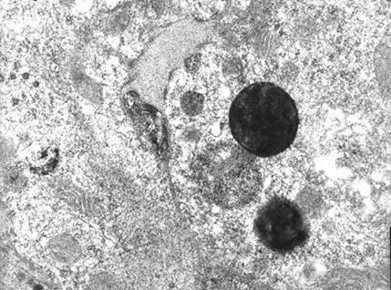 图6-29 肝细胞中的脂褐质 引自《细胞生物学超微结构图谱》1989