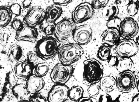 图6-30 台-萨氏综合征神经元中同心圆状的溶酶体 引自《细胞生物学超微结构图谱》1989