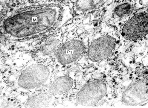 人肝细胞过氧化物酶体(Ps,没有尿酸氧化酶结晶) 引自《细胞生物学超微结构图谱》1989