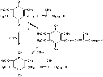 辅酶Q:是脂溶性小分子量的醌类化合物,通过氧化和还原传递电子(图7-9)。有3种氧化还原形式即氧化型醌Q,还原型氢醌(QH2)和介于两者之者的自由基半醌(QH)。