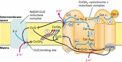 即细胞色素c还原酶,由至少11条不同肽链组成,以二聚体形式存在,每个单体包含两个细胞色素b(b562、b566)、一个细胞色素c1和一个铁硫蛋白。其作用是催化电子从辅酶Q传给细胞色素c,每转移一对电子,同时将4个质子由线粒体基质泵至膜间隙。总的反应结果为: