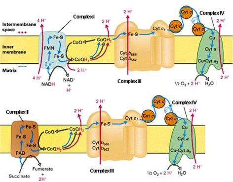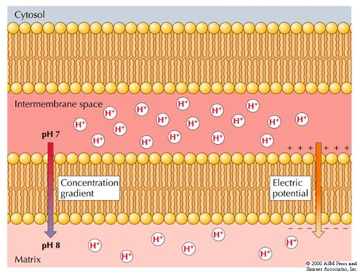 呼吸链各组分有序,使电子按氧化还原电位从低向高传递,能量逐级释放,呼吸链中的复合物Ⅰ、Ⅲ、Ⅳ都是质子泵,可将质子有机质转移到膜间隙,形成质子动力势(proton-motive force),驱动ATP的合成,实验证明人为提高线粒体膜间隙的质子浓度,能使线粒体合成ATP。