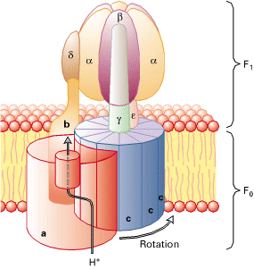 F1由5种多肽组成α3β3γδε复合体,具有三个ATP合成的催化位点(每个β亚基具有一个)。α和β单位交替排列,状如桔瓣。γ贯穿αβ复合体(相当于发电机的转子),并与F0接触,ε帮助γ与F0结合。δ与F0的两个b亚基形成固定αβ复合体的结构(相当于发电机的定子)。