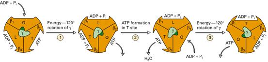 3.质子通过F0时,引起c亚基构成的环旋转,从而带动γ亚基旋转,由于γ亚基的端部是高度不对称的,它的旋转引起β亚基3个催化位点构象的周期性变化(L、T、O),不断将ADP和Pi加合在一起,形成ATP。