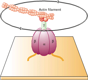 1.日本的吉田(Massasuke Yoshida)等人将α3β3γ固定在玻片上,在γ亚基的顶端连接荧光标记的肌动蛋白纤维,在含有ATP的溶液中温育时,在显微镜下可观察到γ亚基带动肌动蛋白纤维旋转(图7-15)。