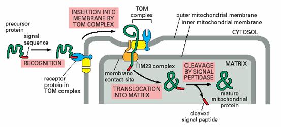 线粒体的蛋白合成能力有限,大量线粒体蛋白在细胞质中合成,定向转运到线粒体。这些蛋白质在在运输以前,以未折叠的前体形式存在,与之结合的分子伴娘(属hsp70家族)保持前体蛋白质处于非折叠状态。通常前体蛋白N端有一段信号序列称为导肽、前导肽或转运肽(leader sequence、presequence或transit-peptide),完成转运后被信号肽酶(signal peptidase)切除,就成为成熟蛋白,这种现象就叫做后转译(posttranslation,图7-27)。