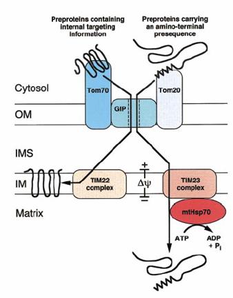 蛋白质的输入是一个耗能的过程,能量的来源为水解ATP和利用质子动力势.能量消耗在线粒体外和进入线粒体基质两步上,在线粒体外解除与前体蛋白质结合的分子伴娘,需要通过水解ATP获得能量;在通过TIM复合体进入基质时利用质子动力势作为动力。虽然目前含不清楚质子动力势是如何被利用的,但解偶连接如DNP能抑制蛋白质的转运。前体蛋白进入线粒体基质后,线粒体hsp70一个接一个的结合在蛋白质线性分子上,像齿轮一样将蛋白质“铰进(hand over hand)”基质,这一过程也需要消耗ATP。然后线粒体hsp70将蛋白质交给hsp60,完成折叠。