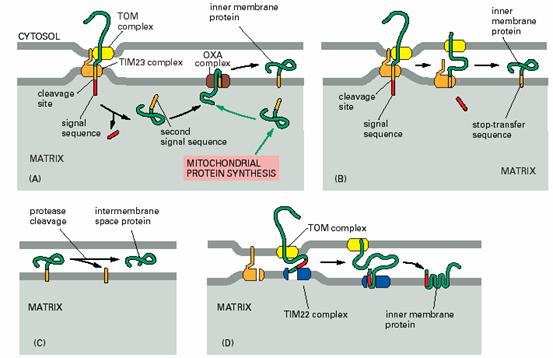 Biology of the Cell. 4th ed. 2002,(A. 进入内膜和膜间隙的前体蛋白具有两个信号序列,经TOM/TIM23进入基质后,第二个信号序列使蛋白通过OXA复合体被安插到内膜上;B. 进入内膜和膜间隙的前体蛋白信号序列后具有停止转移序列,被TIM23安插在膜上,C. 通过途径A、B插入内膜的蛋白,被位于内膜的蛋白酶加工,成为膜间隙的可溶性蛋白,D. 线粒体代谢物的转运器为多次跨膜蛋白,被TIM22安插到内膜中)