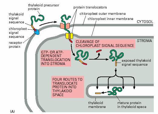 叶绿体蛋白的转运机理与线粒体的相似。如:通常前体蛋白N端具有信号序列,完成转运后被信号肽酶切除,和线粒体一样发生后转译;每一种膜上有特定的转位因子;内外膜具有接触点(contact site);需要能量,同样利用ATP和质子动力势。但是两者的蛋白质转运体系中除了某些hsp分子相同外,转位因子复合体是不同的。叶绿体外膜的转位因子被称为TOC复合体,内膜的转位因子被称为TIC复合体。