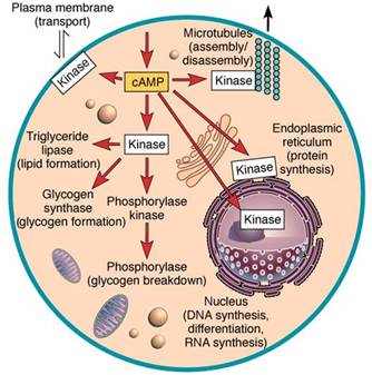 AMP) and ultimately effects a change in the cell's functioning