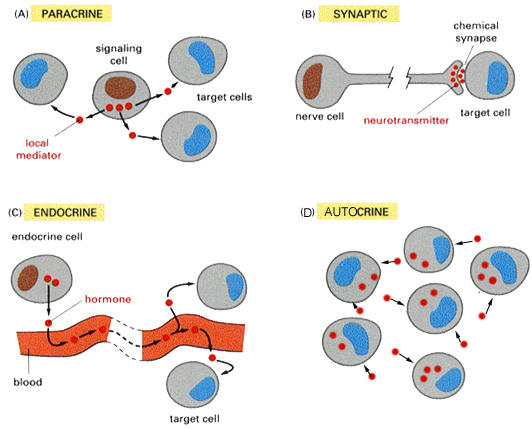 自分泌(autocrine):与上述三类不同的是,信号发放细胞和靶细胞为同类或同一细胞,常见于癌变细胞。如:大肠癌细胞可自分泌产生胃泌素,介导调节c-myc、c-fos和ras p21等癌基因表达,从而促进癌细胞的增殖。
