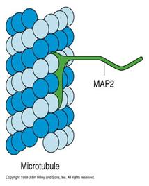 MAP的主要功能是:①促进微管聚集成束;②增加微管稳定性或强度;③促进微管组装。包括I 型和II型两大类, I 型对热敏感,如MAP1a、 MAP1b,主要存在于神经细胞 。II型热稳定性高,包括 MAP2a、b、c,MAP4和tau蛋白。其中 MAP2只存在于神经细胞,,MAP2a的含量减少影响树突的生长。