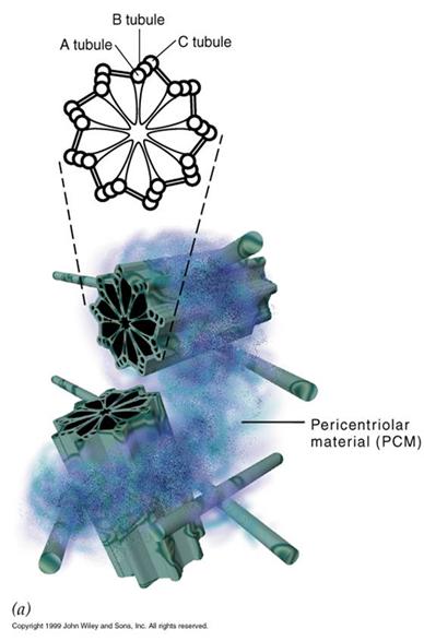 中心体(centrosome)位于细胞的中心部位(图9-18)。由两个相互垂直的中心粒(centriole)构成(图9-19),周围是一些无定形或纤维形、高电子密度的物质,叫做外中心粒物质(PCM,pericentriolar material)。中心粒直径0.2mm,长0.4mm,由9组3联微管构成,不直接参与微管蛋白的核化,具有召集PCM的作用。