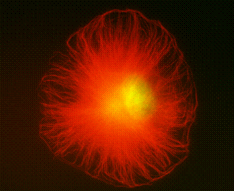 图9-20 以细胞核为中心向外放射状排列的微管纤维(红色)图片来自http://www.itg.uiuc.edu/