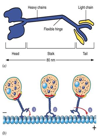 Kinesin发现于1985年,是由两条轻链和两条重链构成的四聚体(图9-21),外观具有两个球形的头(具有ATP酶活性)、一个螺旋状的杆和两个扇子状的尾。通过结合和水解ATP,导致颈部发生构象改变,使两个头部交替与微管结合,从而沿微管“行走”,将“尾部”结合的“货物”(运输泡或细胞器)转运到其它地方。据估计哺乳动物中类似于kinesin的蛋白(KLP, kinesin-like protein or KRB, kinesin-related