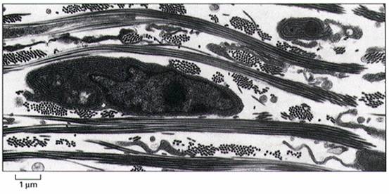 胶原是动物体内含量最丰富的蛋白质,约占人体蛋白质总量的30%以上。它遍布于体内各种器官和组织,是细胞外基质中的框架结构,可由成纤维细胞(图10-3)、软骨细胞、成骨细胞及某些上皮细胞合成并分泌到细胞外。