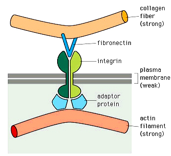 FN肽链中的一些短肽序列为细胞表面的各种FN受体识别与结合的最小结构单位。例如,在肽链中央的与细胞相结合的模块中存在RGD(Arg-Gly-Asp)序列,为与细胞表面某些整合素受体识别与结合的部位。化学合成的RGD三肽可抑制细胞在FN基质上粘附。
