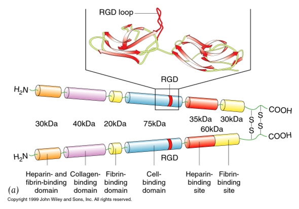 每条FN肽链约含2450个氨基酸残基,整个肽链由三种类型(Ⅰ、Ⅱ、Ⅲ)的模块(module)重复排列构成。具有5-7个有特定功能的结构域,由对蛋白酶敏感的肽段连接。这些结构域中有些能与其它ECM(如胶原、蛋白聚糖)结合,使细胞外基质形成网络;有些能与细胞表面的受体结合,使细胞附着与ECM上。