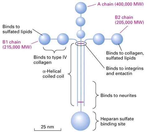 LN分子中至少存在8个与细胞结合的位点。例如,在长臂靠近球区的。链上有IKVAV五肽序列可与神经细胞结合,并促进神经生长。鼠LNα1链上的RGD序列,可与αvβ3整合素结合。