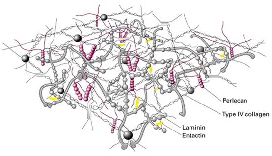 基膜中除LN和Ⅳ型胶原外,还具有entactin、perlecan、decorin等多种蛋白,其中LN与entactin (also called nidogen)形成1:1紧密结合的复合物,通过nidogen与Ⅳ型胶原结合(图10-8)。