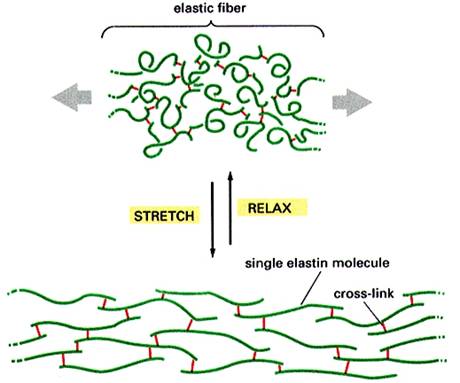 在弹性蛋白的外围包绕着一层由微原纤维构成的壳。微原纤维是由一些糖蛋白构成的。其中一种较大的糖蛋白是fibrillin,为保持弹性纤维的完整性所必需。在发育中的弹性组织内,糖蛋白微原纤维常先于弹性蛋白出现,似乎是弹性蛋白附着的框架,对于弹性蛋白分子组装成弹性纤维具有组织作用。老年组织中弹性蛋白的生成减少,降解增强,以致组织失去弹性。