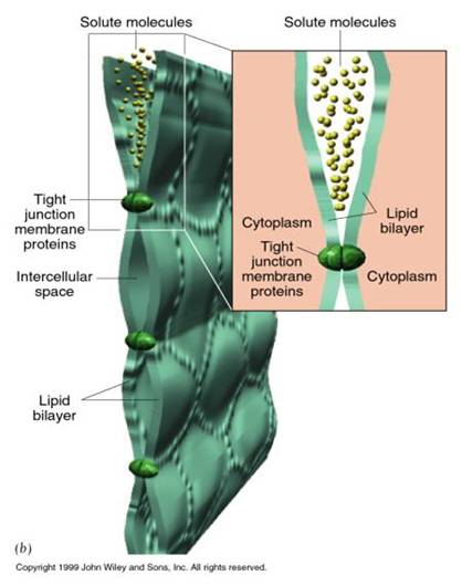 紧密连接的主要作用是封闭相邻细胞间的接缝,防止溶液中的分子沿细胞间隙渗入体内,从而保证了机体内环境的相对稳定;消化道上皮、膀胱上皮、脑毛细血管内皮以及睾丸支持细胞之间都存在紧密连接。后二者分别构成了脑血屏障和睾血屏障,能保护这些重要器官和组织免受异物侵害。在各种组织中紧密连接对一些小分子的密封程度有所不同,例如小肠上皮细胞的紧密连接对Na+的渗漏程度比膀胱上皮大1万倍。