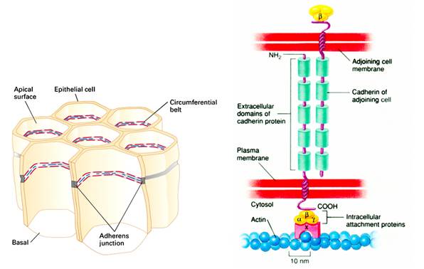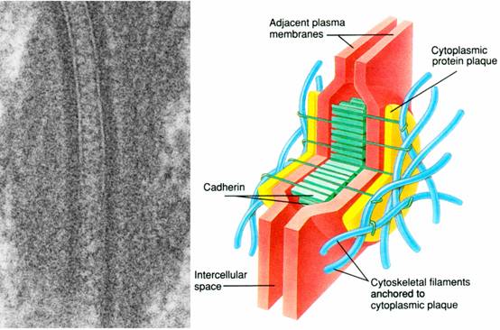 粘合带处的质膜下方有与质膜平行排列的肌动蛋白束,钙粘蛋白通过附着蛋白与肌动蛋白束相结合。于是,相邻细胞中的肌动蛋白丝束通过钙粘蛋白和附着蛋白编织成了一个广泛的网络,把相邻细胞联合在一起。